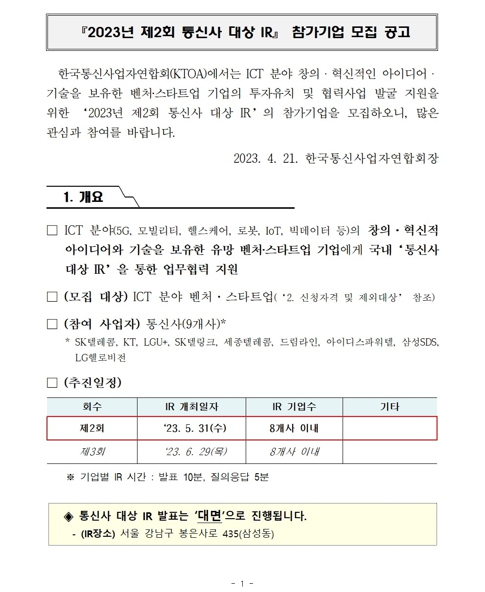 2023년 제2회 통신사 대상 IR 참가기업 모집 공고