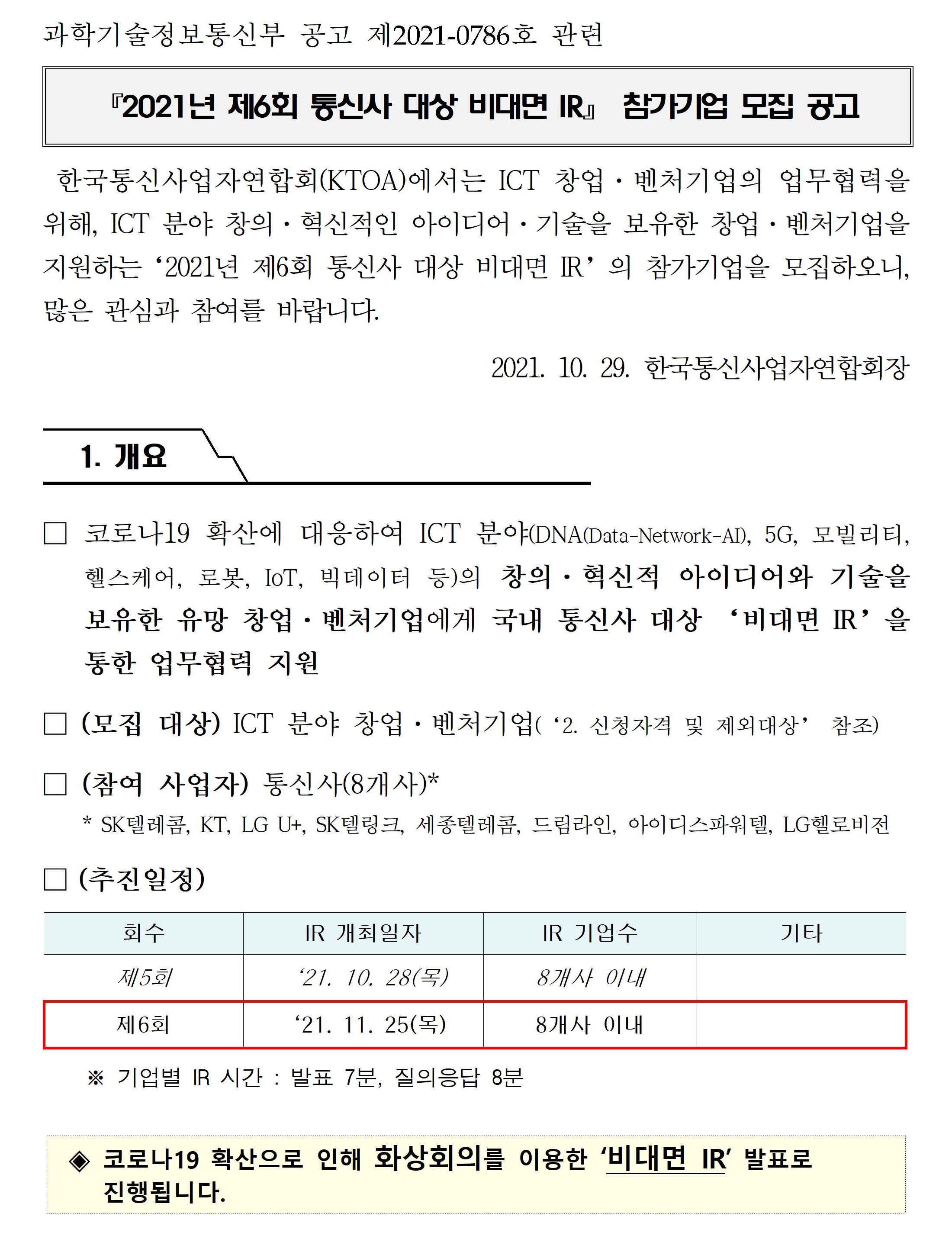 「2021년 제6회 통신사 대상 비대면 IR」 참가기업 모집공고