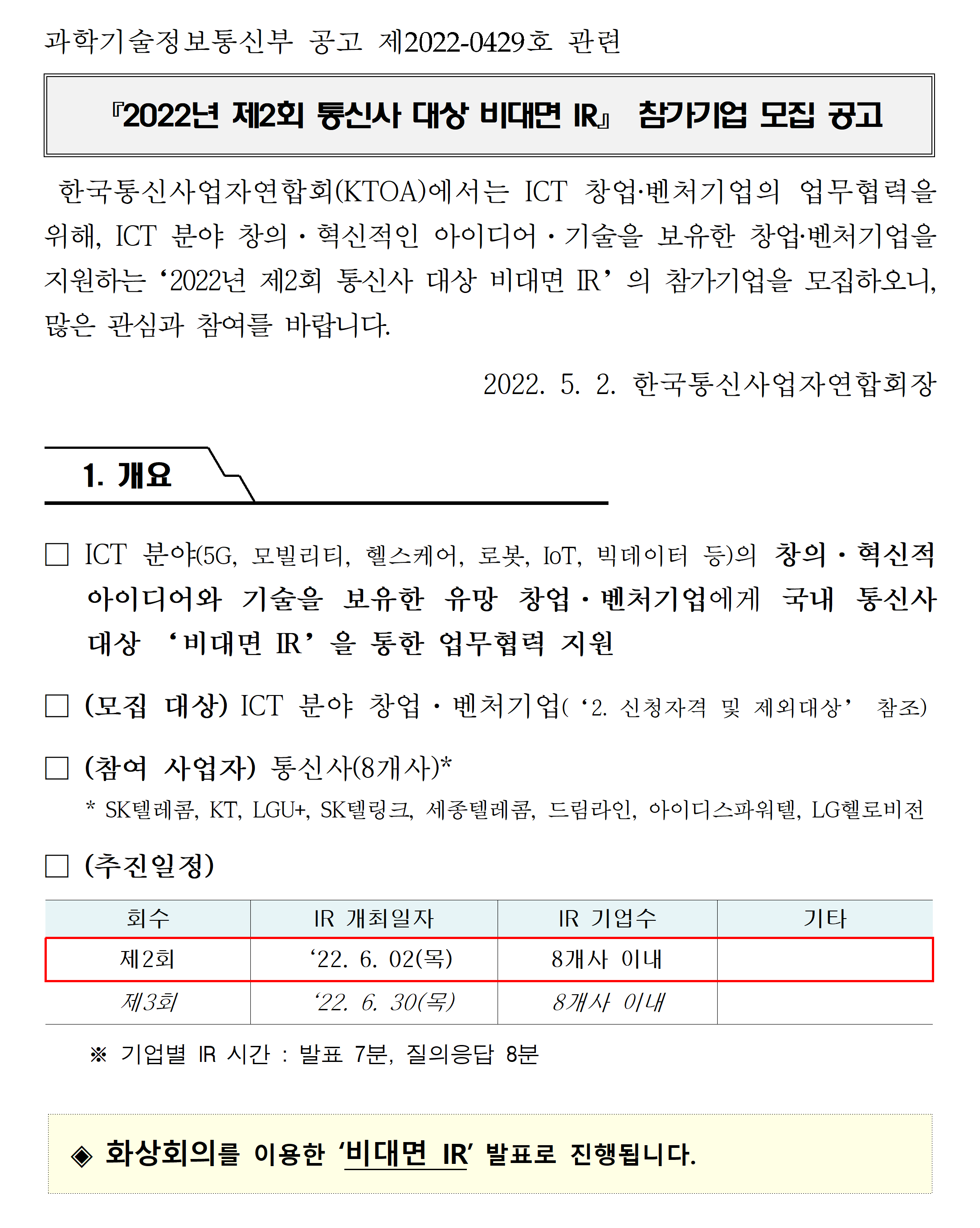 「2022년 제2회 통신사 대상 비대면 IR」 참가기업 모집공고