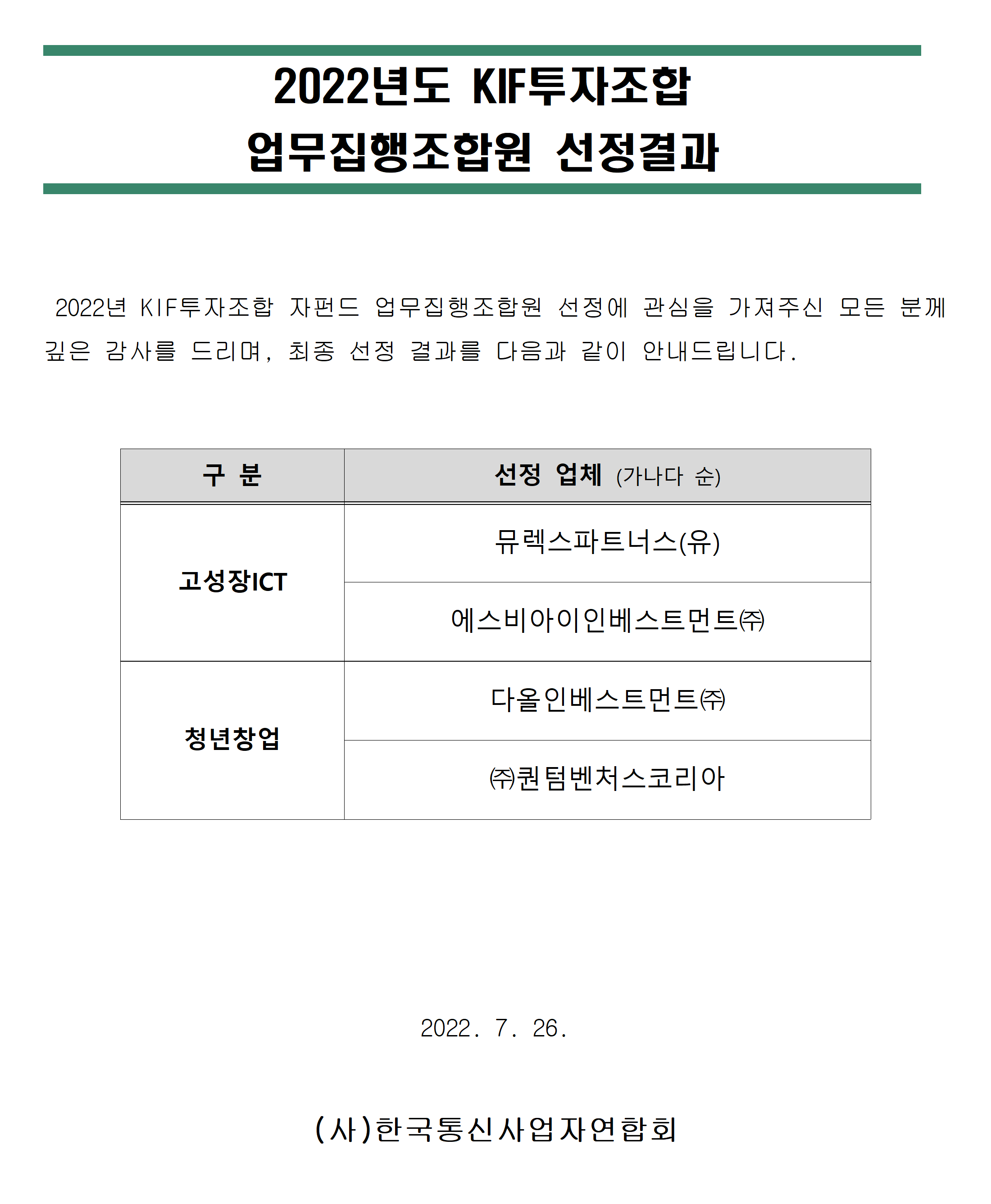 2022년 KIF투자조합 자펀드 업무집행조합원 선정결과