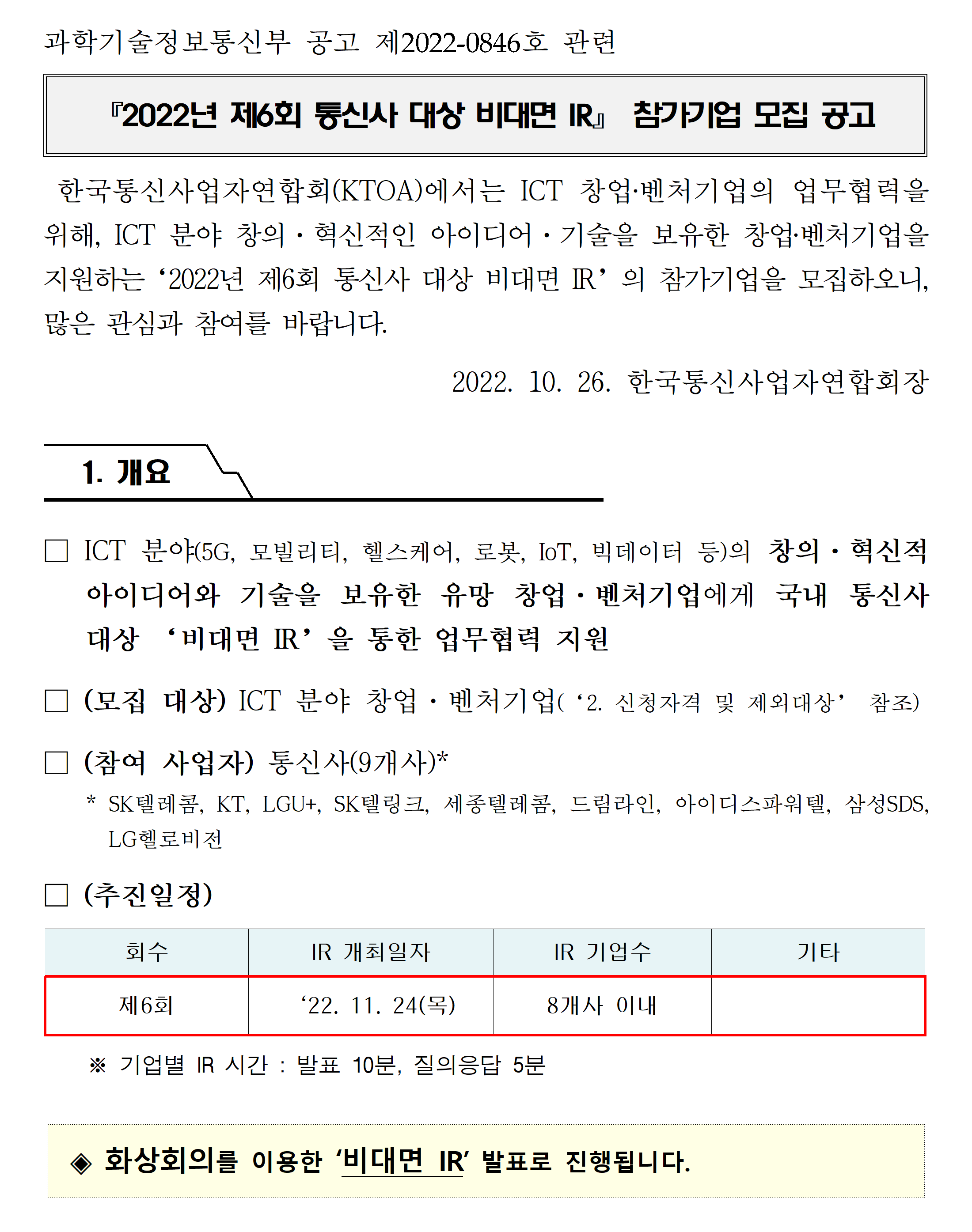 「2022년 제6회 통신사 대상 비대면 IR」 참가기업 모집공고