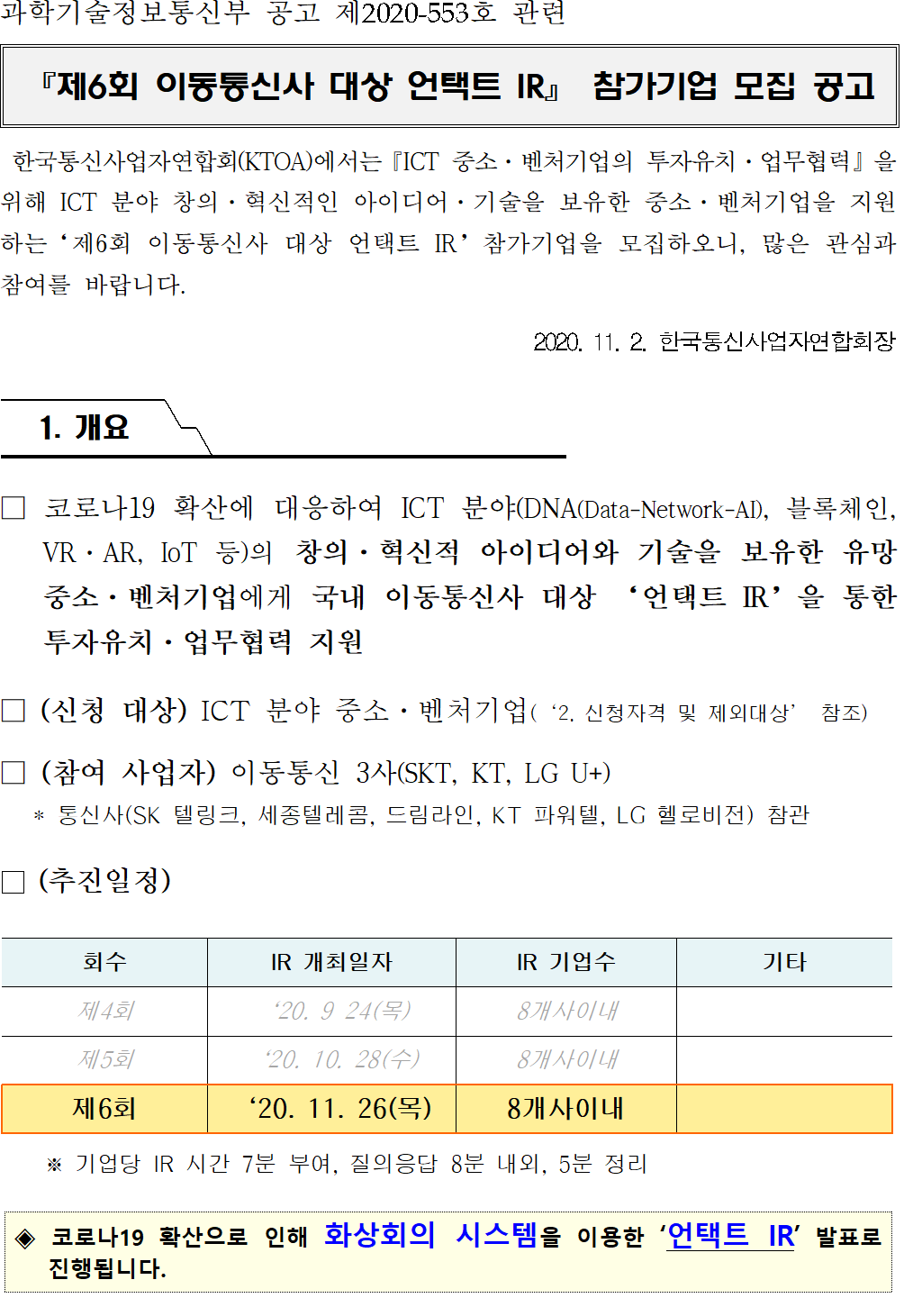 제6회 이동통신사 대상 언택트 IR 참가기업 모집 공고