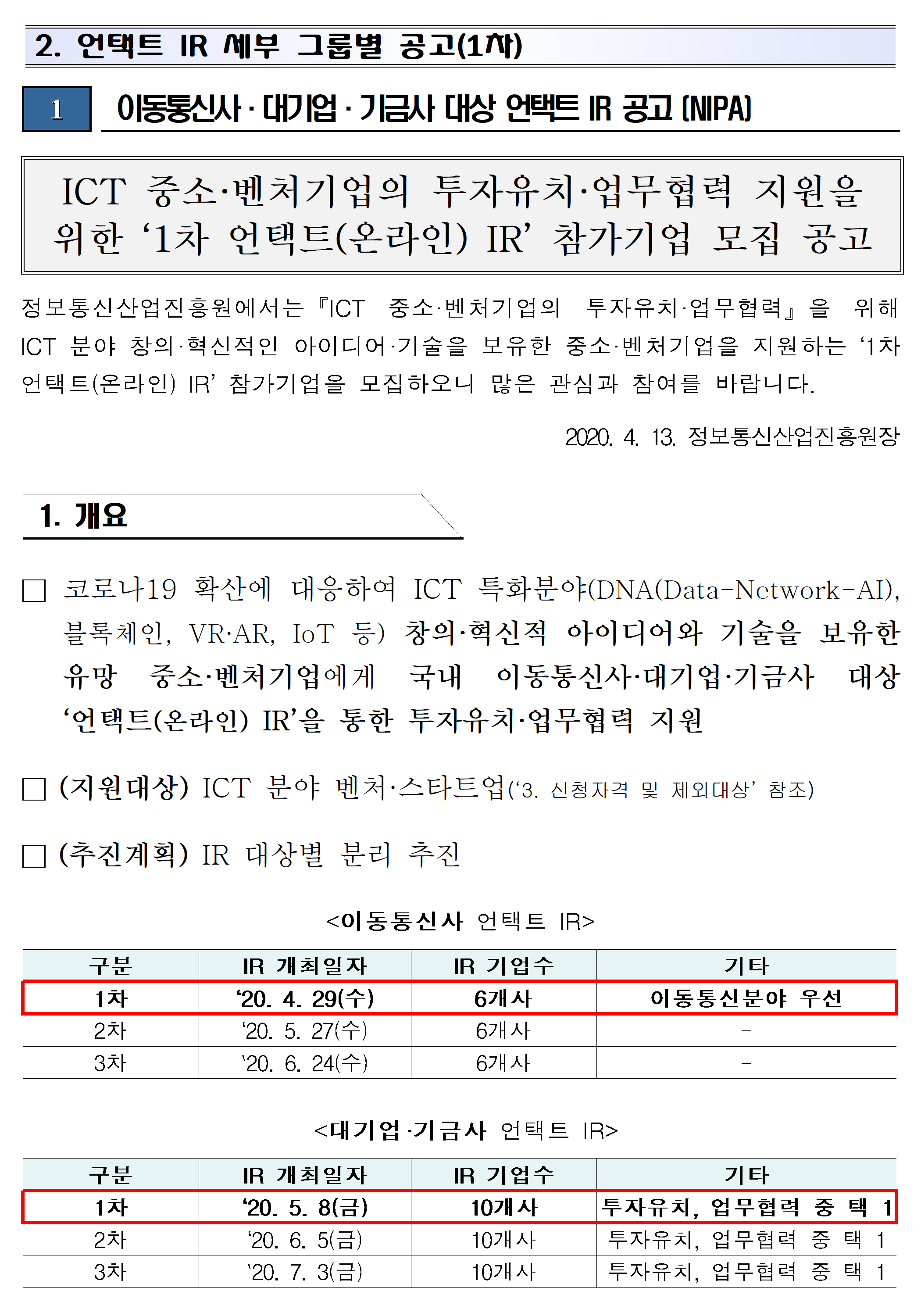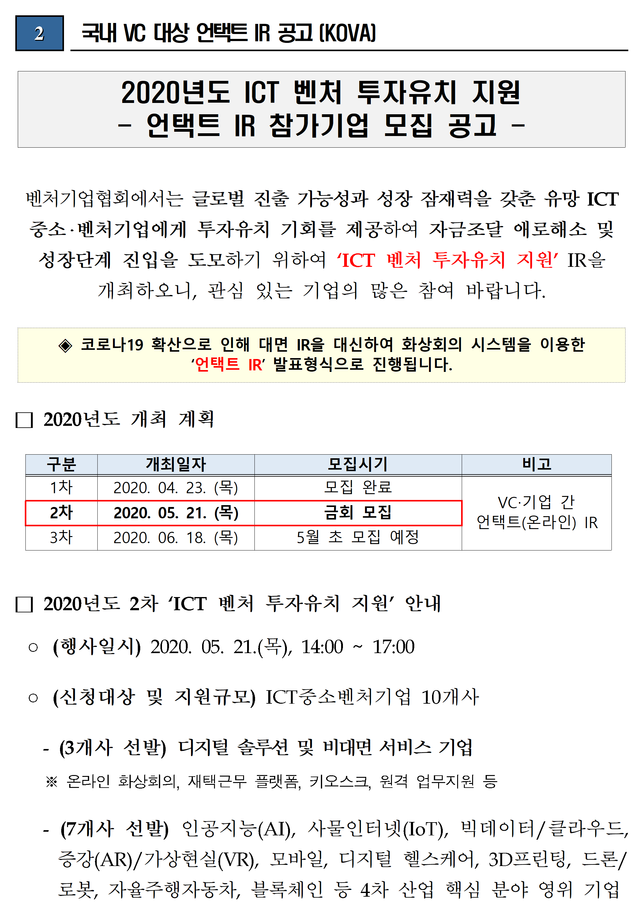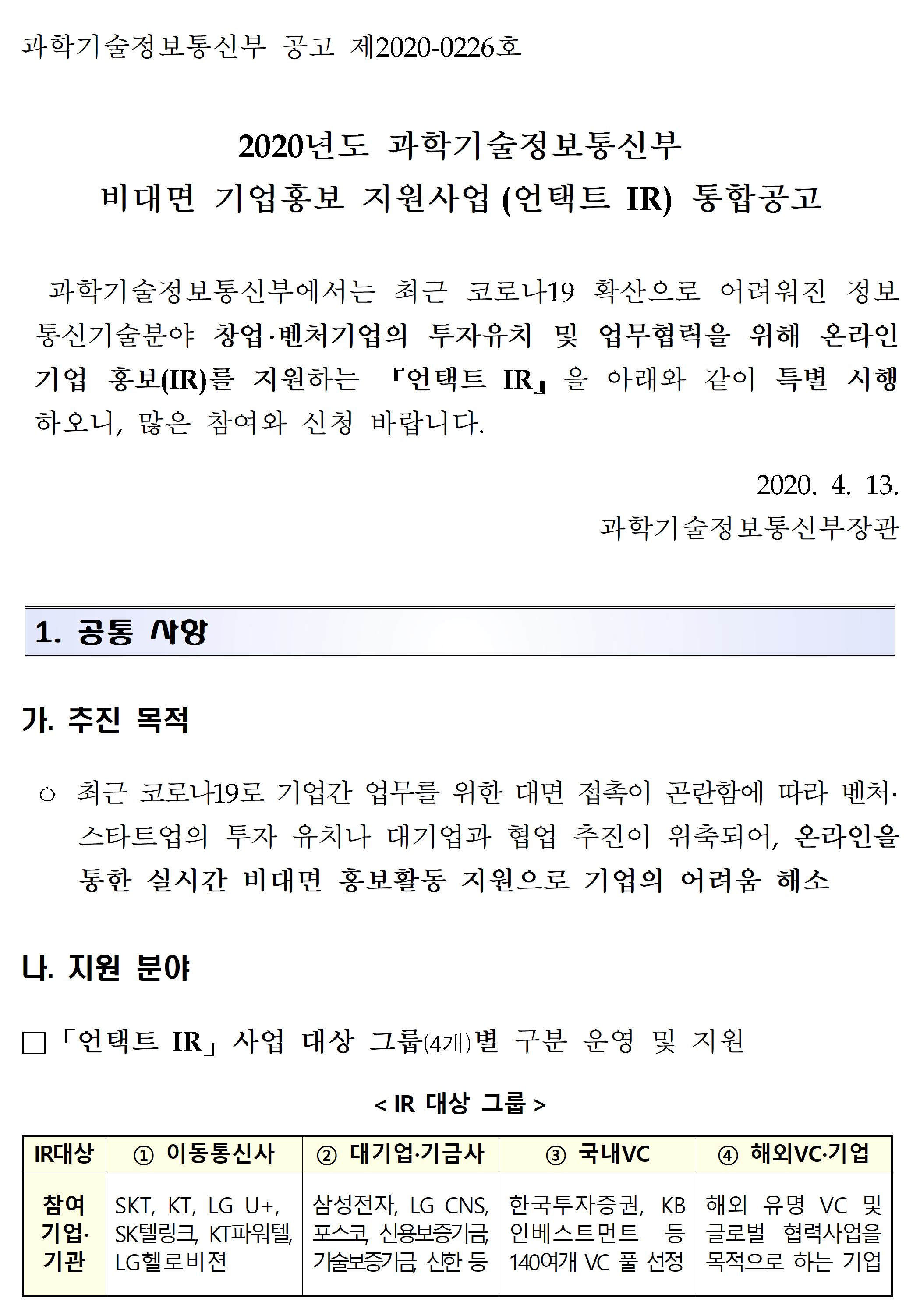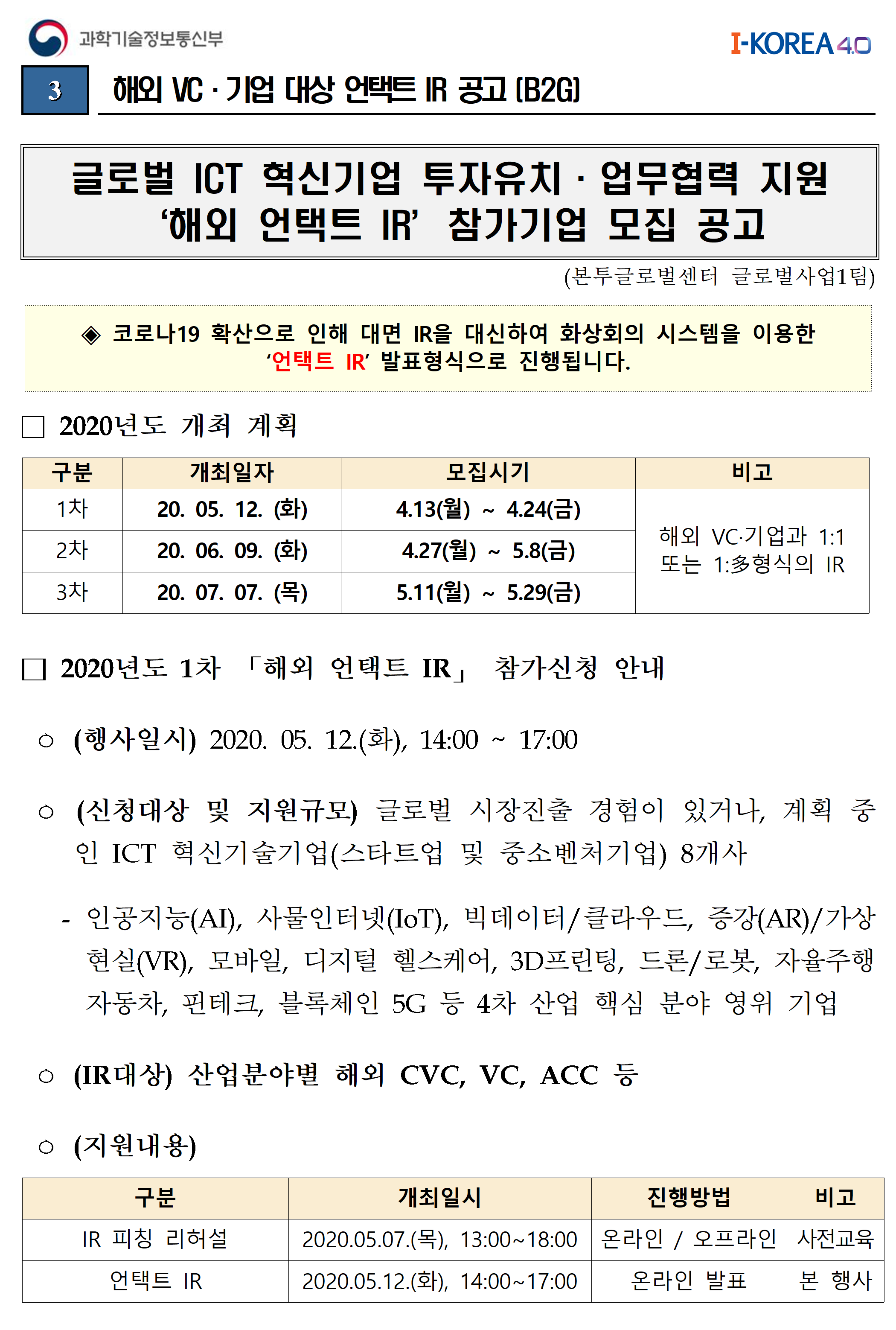 과학기술정보통신부 공고 제2020-0226호 2020년도 과학기술정보통신부 비대면 기업홍보 지원사업(언택트 IR) 통합공고 과학기술정보통신부에서는 최근 코로나19 확산으로 어려워진 정보통신기술분야 창업·벤처기업의 투자유치 및 업무협력을 위해 온라인 기업 홍보(IR)를 지원하는 언택트 IR을 아래와 같이 특별 시행하오니, 많은 참여와 신청 바랍니다. 2020. 4. 13. 과학기술정보통신부장관 1. 공통 사항 가. 추진 목적 ㅇ 최근 코로나19로 기업간 업무를 위한 대면 접촉이 곤란함에 따라 벤처·스타트업의 투자 유치나 대기업과 협업 추진이 위축되어, 온라인을 통한 실시간 비대면 홍보활동 지원으로 기업의 어려움 해소 나. 지원 분야 언택트 IR사업 대상 그룹(4개)별 구분 운영 및 지원 IR 대상 그룹 IR대상 ① 이동통신사 ② 대기업·기금사 ③ 국내VC ④ 해외VC·기업 참여기업· 기관 SKT, KT, LG U+, SK텔링크, KT파워텔, LG헬로비젼 삼성전자, LG CNS, 포스코, 신용보증기금, 기술보증기금, 신한 등 한국투자증권, KB인베스트먼트 등 140여개 VC 풀 선정 해외 유명 VC 및 글로벌 협력사업을 목적으로 하는 기업 다. 그룹별 개요 및 공고 일정 ‘이동통신사 대상’언택트 IR ㅇ 주관 : 한국통신사업자연합회(KTOA) ㅇ IR 대상 : SKT, KT, LG U+, SK텔링크, KT 파워텔, LG 헬로비전 ㅇ 지원 대상 : 3대 이동통신사·별정통신사와의 업무협력 및 투자 유치를 필요로 하는 ICT분야 벤처·스타트업 ㅇ 추진 일정 이동통신사 IR 회수 공고기간 선발기간 IR 행사일 제1회 4.13(월) ~ 4.20(월) 4.21(화) ~ 4.24(금) 4.29(수) 제2회 4.27(월) ~ 5.11(월) 5.12(화) ~ 5.19(화) 5.27(수) 제3회 5.18(월) ~ 6.1(월) 6.2(화) ~ 6.9(화) 6.24(수) ※ 제1회를 제외하고 ‘대기업·기금사 대상’ 언택트 IR과 공고기간 동일 ‘대기업·기금사 대상’언택트 IR ㅇ 주관 : 정보통신산업진흥원(NIPA) ㅇ IR 대상 : ‘ICT 창업벤처 민관협의체’ 유관 대기업* 및 기금사 * 삼성전자, LG CNS, 포스코, 롯데 액셀러레이터, 카카오 벤처스, 신용보증기금, 기술보증기금, 신한금융그룹 등 ㅇ 지원 대상 : 대기업·기금사와의 업무협력 및 투자유치를 필요로 하는 ICT분야 벤처·스타트업 ㅇ 추진 일정 대기업·기금사 IR 회수 공고기간 선발 및 매칭기간 IR 행사일 제1회 4.13(월) ~ 4.24(금) 4.27(월) ~ 5.1(금) 5.8(금) 제2회 4.27(월) ~ 5.11(월) 5.12(화) ~ 5.26(화) 6.5(금) 제3회 5.18(월) ~ 6.1(월) 6.2(화) ~ 6.16(화) 7.3(금) ‘국내 벤처캐피털(VC) 대상’언택트 IR ㅇ 주관 : 벤처기업협회(KOVA) ㅇ IR 대상 : 국내 VC (KB인베스트먼트 등 국내 140개사 풀 중 희망 VC 참여) ㅇ 지원 대상 : VC의 투자유치를 필요로 하는 ICT분야 벤처·스타트업* * 비대면 서비스 스타트업 우선 선발(예정) ㅇ 추진 일정 국내 VC IR 회수 공고기간 선발 및 코칭기간 IR 행사일 제1회 별도 공고를 통한 선발 완료 4.23(목) 제2회 4.2(목) ~ 4.17(금) 4.20(월) ~ 5.14(목) 5.21(목) 제3회 5.4(월) ~ 5.18(월) 5.20(수) ~ 6.11(목) 6.18(목) ‘해외 벤처캐피털(VC)·기업 대상’언택트 IR ㅇ 주관 : 본투글로벌센터(B2G) ㅇ IR 대상 : 해외 VC 및 기업 ㅇ 지원 대상 : 글로벌 진출을 목표로, 해외 투자유치 및 업무 협력을 필요로 하는 ICT분야 벤처·스타트업 ㅇ 공고 일정 해외 VC·기업 IR 회수 공고기간 선발 및 매칭기간 IR 행사일 제1회 4.13(월) ~ 4.24(금) 4.27(월) ~ 5.4(월) 5.12(화) 제2회 4.27(월) ~ 5.8(금) 5.11(월) ~ 5.25(월) 6.9(화) 제3회(예정) 5.11(월) ~ 5.29(금) 6.1(월) ~ 6.15(월) 7.7(화) 라. 기타 참고사항 ㅇ 본 사업은 코로나19 확산에 따라 기업간 대면이 어려운 현 상황에 맞춰 비대면 IR을 추진하는 것으로, 상황 종료시 일정이 별도의 예고없이 중단될 수 있음 ※ 일정 중단 시 대면 IR 전환 여부는 추후 검토·결정 ㅇ 그룹별로 지원 요건 및 제출 서류가 상이하므로 ‘2.세부 그룹별 공고’ 참고 필요 ※ 이동통신사 및 대기업·기금사 언택트 IR은 NIPA에서 ‘이동통신사·대기업·기금사’로 일괄 모집·공고함(KTOA 별도 공고 없음) 마. 언택트IR 관련 문의 ㅇ 사업문의(총괄) : NIPA 글로벌창업팀 이종현 책임(043-931-5559) IR 그룹명 담당기관 담당자 문의처 ‘이동통신사’ 언택트 IR 한국통신사업자연합 (KTOA) 정원선 대리 cws@ktoa.or.kr 02-2015-9115 ‘대기업·기금사’ 언택트 IR 정보통신산업진흥원 (NIPA) 윤후성 수석 k-startup@nipa.kr 043-931-5556 ‘국내 VC’ 언택트 IR 벤처기업협회 (KOVA) 연도영 대리 dyyon@kova.or.kr 02-6331-7033 ‘해외 VC·기업’ 언택트 IR 본투글로벌센터 (B2G) 백민정 선임 info@born2global.com 031-5171-5612 2. 언택트 IR 세부 그룹별 공고(1차) 1 이동통신사·대기업·기금사 대상 언택트 IR 공고 (NIPA) ICT 중소·벤처기업의 투자유치·업무협력 지원을 위한 ‘1차 언택트(온라인) IR’ 참가기업 모집 공고 정보통신산업진흥원에서는ICT 중소·벤처기업의 투자유치·업무협력을 위해 ICT 분야 창의·혁신적인 아이디어·기술을 보유한 중소·벤처기업을 지원하는 ‘1차 언택트(온라인) IR’ 참가기업을 모집하오니 많은 관심과 참여를 바랍니다. 2020. 4. 13. 정보통신산업진흥원장 1. 개요 코로나19 확산에 대응하여 ICT 특화분야(DNA(Data-Network-AI), 블록체인, VR·AR, IoT 등) 창의·혁신적 아이디어와 기술을 보유한 유망 중소·벤처기업에게 국내 이동통신사·대기업·기금사 대상 ‘언