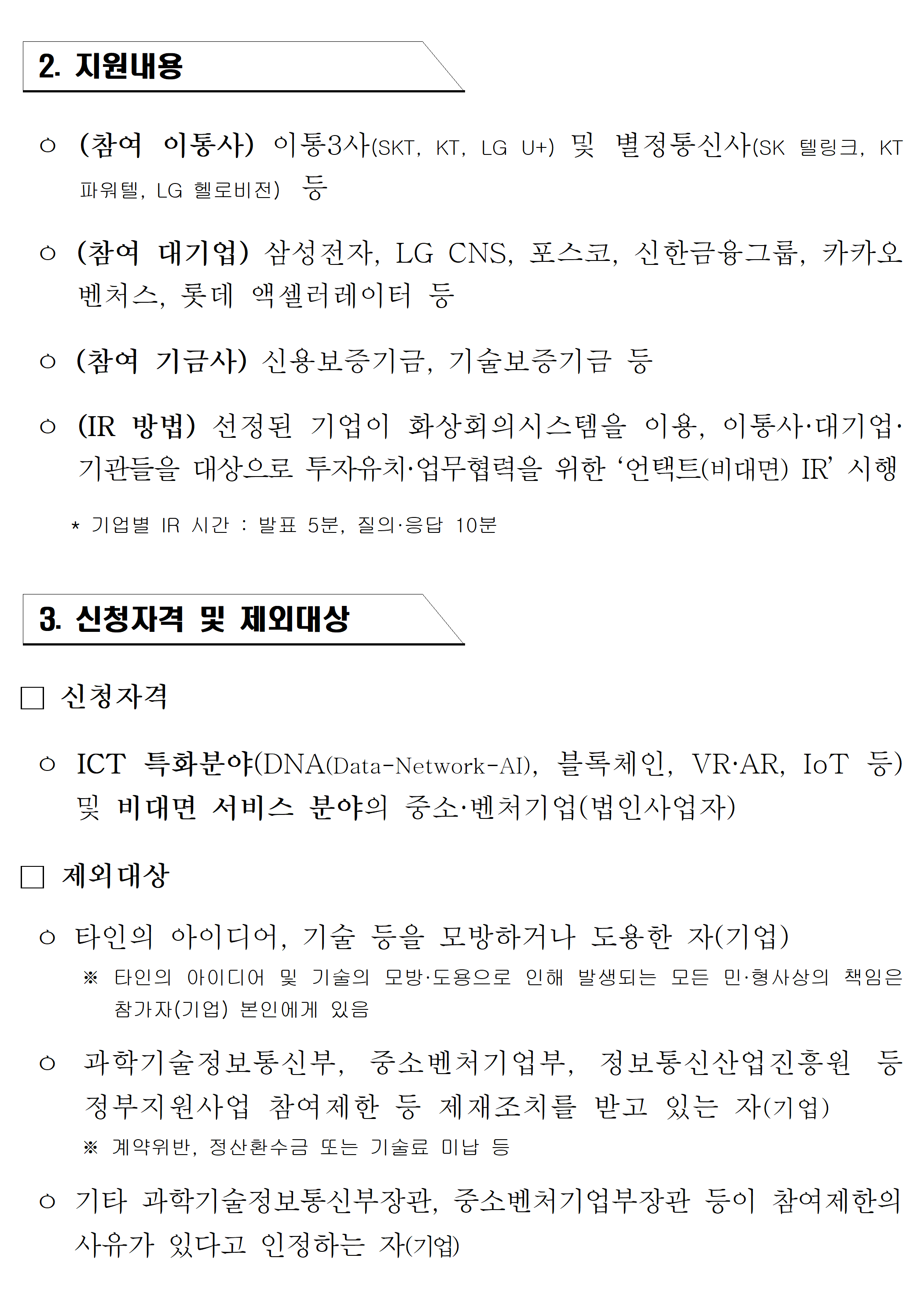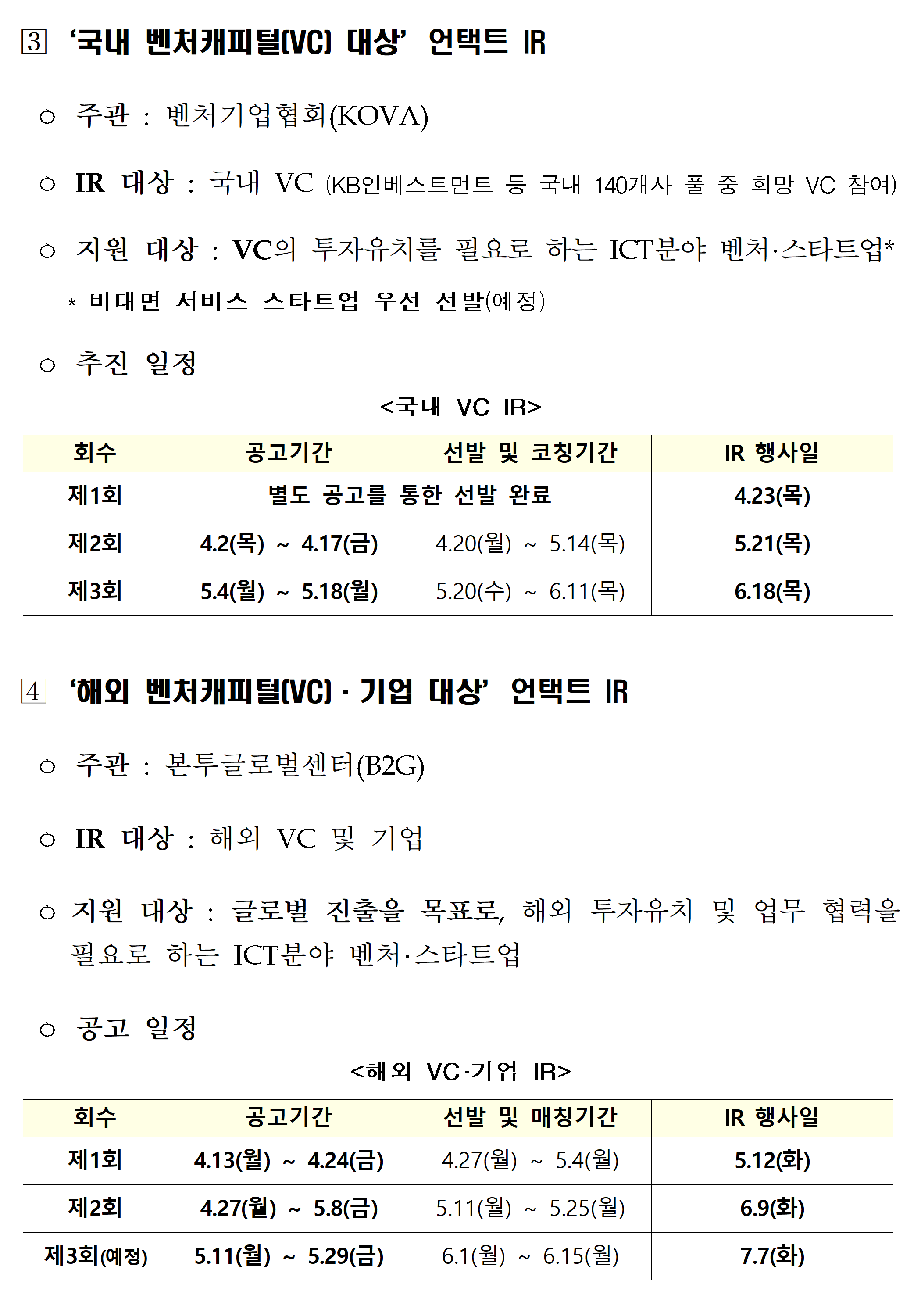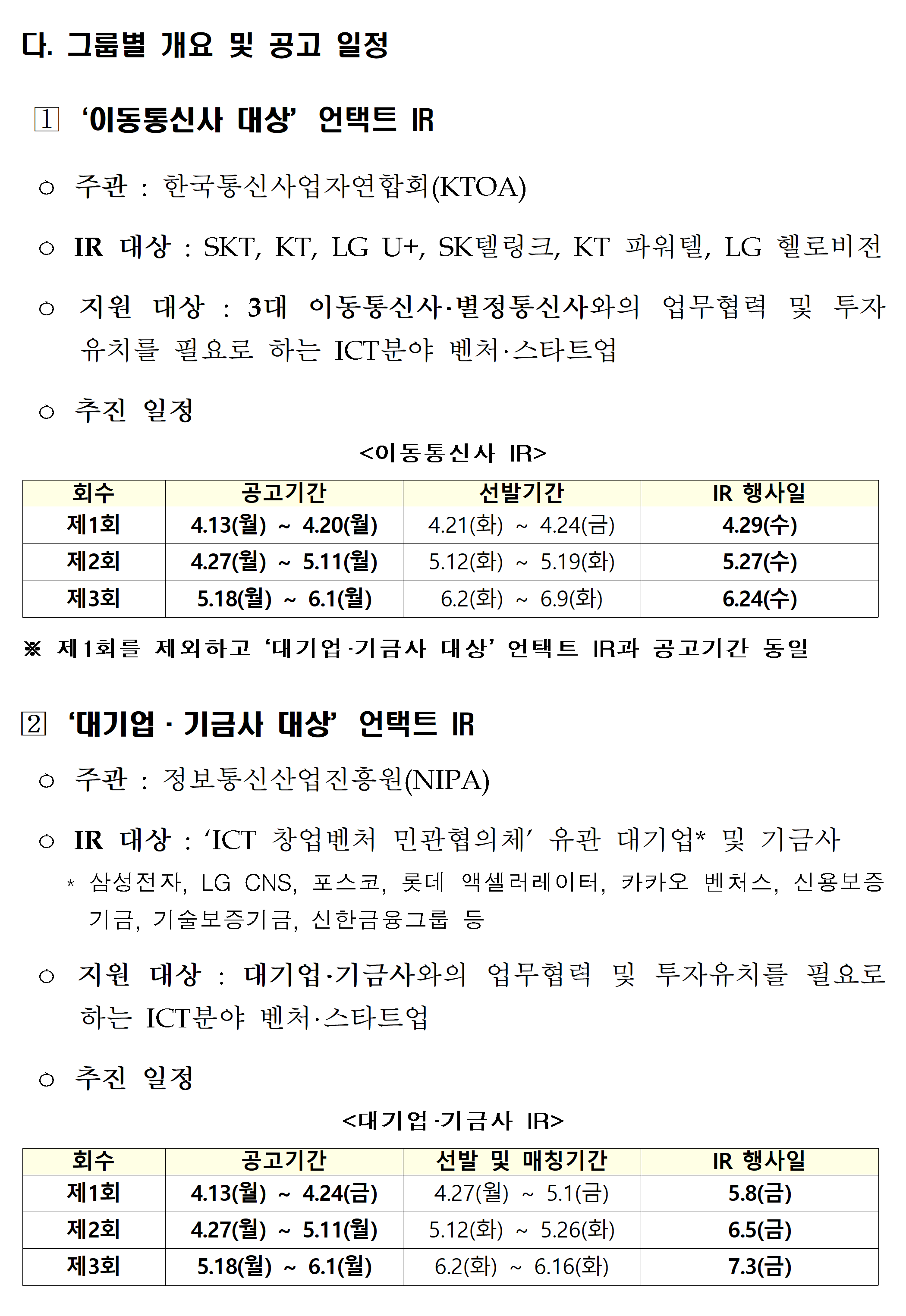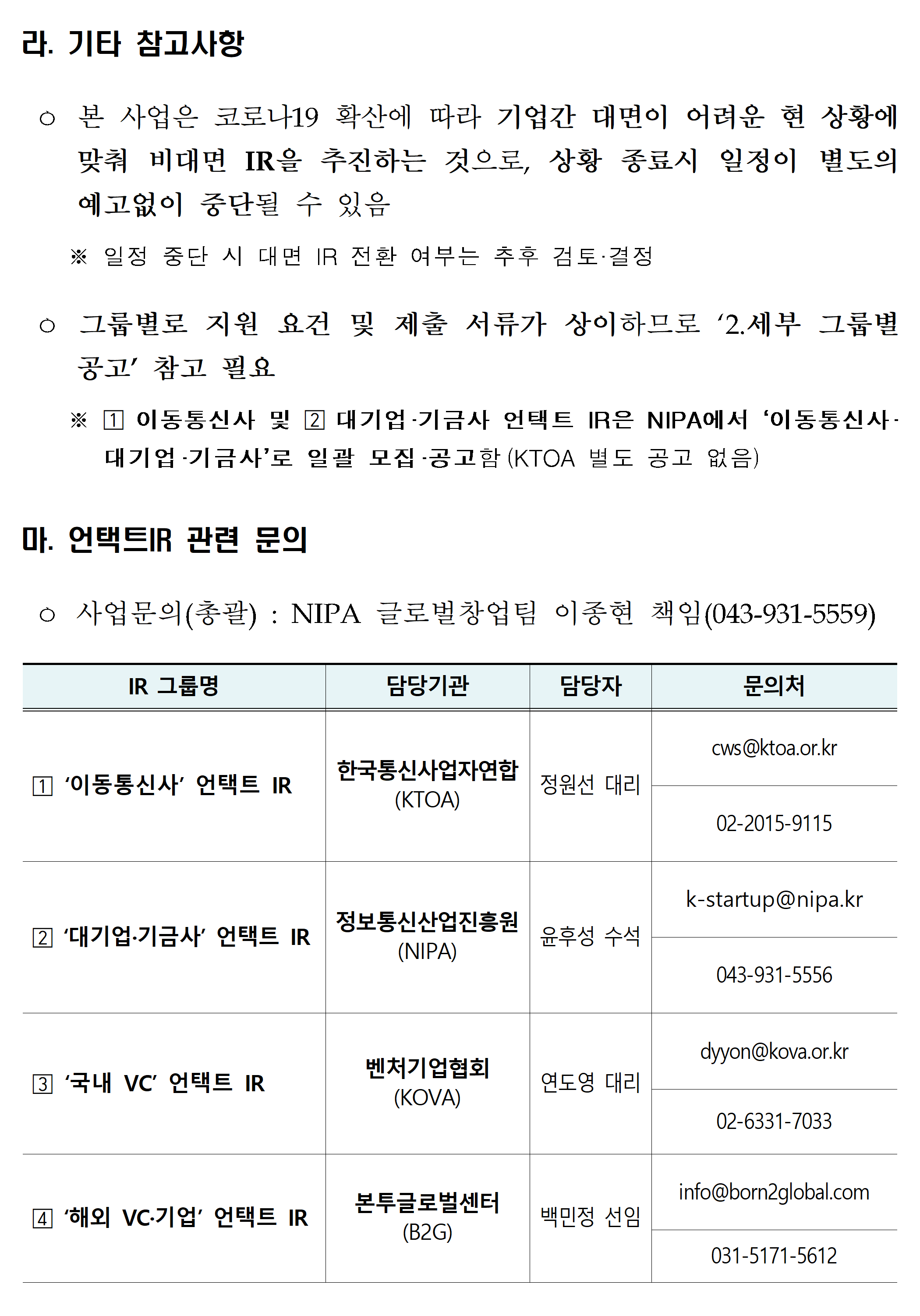 과학기술정보통신부 공고 제2020-0226호 2020년도 과학기술정보통신부 비대면 기업홍보 지원사업(언택트 IR) 통합공고 과학기술정보통신부에서는 최근 코로나19 확산으로 어려워진 정보통신기술분야 창업·벤처기업의 투자유치 및 업무협력을 위해 온라인 기업 홍보(IR)를 지원하는 언택트 IR을 아래와 같이 특별 시행하오니, 많은 참여와 신청 바랍니다. 2020. 4. 13. 과학기술정보통신부장관 1. 공통 사항 가. 추진 목적 ㅇ 최근 코로나19로 기업간 업무를 위한 대면 접촉이 곤란함에 따라 벤처·스타트업의 투자 유치나 대기업과 협업 추진이 위축되어, 온라인을 통한 실시간 비대면 홍보활동 지원으로 기업의 어려움 해소 나. 지원 분야 언택트 IR사업 대상 그룹(4개)별 구분 운영 및 지원 IR 대상 그룹 IR대상 ① 이동통신사 ② 대기업·기금사 ③ 국내VC ④ 해외VC·기업 참여기업· 기관 SKT, KT, LG U+, SK텔링크, KT파워텔, LG헬로비젼 삼성전자, LG CNS, 포스코, 신용보증기금, 기술보증기금, 신한 등 한국투자증권, KB인베스트먼트 등 140여개 VC 풀 선정 해외 유명 VC 및 글로벌 협력사업을 목적으로 하는 기업 다. 그룹별 개요 및 공고 일정 ‘이동통신사 대상’언택트 IR ㅇ 주관 : 한국통신사업자연합회(KTOA) ㅇ IR 대상 : SKT, KT, LG U+, SK텔링크, KT 파워텔, LG 헬로비전 ㅇ 지원 대상 : 3대 이동통신사·별정통신사와의 업무협력 및 투자 유치를 필요로 하는 ICT분야 벤처·스타트업 ㅇ 추진 일정 이동통신사 IR 회수 공고기간 선발기간 IR 행사일 제1회 4.13(월) ~ 4.20(월) 4.21(화) ~ 4.24(금) 4.29(수) 제2회 4.27(월) ~ 5.11(월) 5.12(화) ~ 5.19(화) 5.27(수) 제3회 5.18(월) ~ 6.1(월) 6.2(화) ~ 6.9(화) 6.24(수) ※ 제1회를 제외하고 ‘대기업·기금사 대상’ 언택트 IR과 공고기간 동일 ‘대기업·기금사 대상’언택트 IR ㅇ 주관 : 정보통신산업진흥원(NIPA) ㅇ IR 대상 : ‘ICT 창업벤처 민관협의체’ 유관 대기업* 및 기금사 * 삼성전자, LG CNS, 포스코, 롯데 액셀러레이터, 카카오 벤처스, 신용보증기금, 기술보증기금, 신한금융그룹 등 ㅇ 지원 대상 : 대기업·기금사와의 업무협력 및 투자유치를 필요로 하는 ICT분야 벤처·스타트업 ㅇ 추진 일정 대기업·기금사 IR 회수 공고기간 선발 및 매칭기간 IR 행사일 제1회 4.13(월) ~ 4.24(금) 4.27(월) ~ 5.1(금) 5.8(금) 제2회 4.27(월) ~ 5.11(월) 5.12(화) ~ 5.26(화) 6.5(금) 제3회 5.18(월) ~ 6.1(월) 6.2(화) ~ 6.16(화) 7.3(금) ‘국내 벤처캐피털(VC) 대상’언택트 IR ㅇ 주관 : 벤처기업협회(KOVA) ㅇ IR 대상 : 국내 VC (KB인베스트먼트 등 국내 140개사 풀 중 희망 VC 참여) ㅇ 지원 대상 : VC의 투자유치를 필요로 하는 ICT분야 벤처·스타트업* * 비대면 서비스 스타트업 우선 선발(예정) ㅇ 추진 일정 국내 VC IR 회수 공고기간 선발 및 코칭기간 IR 행사일 제1회 별도 공고를 통한 선발 완료 4.23(목) 제2회 4.2(목) ~ 4.17(금) 4.20(월) ~ 5.14(목) 5.21(목) 제3회 5.4(월) ~ 5.18(월) 5.20(수) ~ 6.11(목) 6.18(목) ‘해외 벤처캐피털(VC)·기업 대상’언택트 IR ㅇ 주관 : 본투글로벌센터(B2G) ㅇ IR 대상 : 해외 VC 및 기업 ㅇ 지원 대상 : 글로벌 진출을 목표로, 해외 투자유치 및 업무 협력을 필요로 하는 ICT분야 벤처·스타트업 ㅇ 공고 일정 해외 VC·기업 IR 회수 공고기간 선발 및 매칭기간 IR 행사일 제1회 4.13(월) ~ 4.24(금) 4.27(월) ~ 5.4(월) 5.12(화) 제2회 4.27(월) ~ 5.8(금) 5.11(월) ~ 5.25(월) 6.9(화) 제3회(예정) 5.11(월) ~ 5.29(금) 6.1(월) ~ 6.15(월) 7.7(화) 라. 기타 참고사항 ㅇ 본 사업은 코로나19 확산에 따라 기업간 대면이 어려운 현 상황에 맞춰 비대면 IR을 추진하는 것으로, 상황 종료시 일정이 별도의 예고없이 중단될 수 있음 ※ 일정 중단 시 대면 IR 전환 여부는 추후 검토·결정 ㅇ 그룹별로 지원 요건 및 제출 서류가 상이하므로 ‘2.세부 그룹별 공고’ 참고 필요 ※ 이동통신사 및 대기업·기금사 언택트 IR은 NIPA에서 ‘이동통신사·대기업·기금사’로 일괄 모집·공고함(KTOA 별도 공고 없음) 마. 언택트IR 관련 문의 ㅇ 사업문의(총괄) : NIPA 글로벌창업팀 이종현 책임(043-931-5559) IR 그룹명 담당기관 담당자 문의처 ‘이동통신사’ 언택트 IR 한국통신사업자연합 (KTOA) 정원선 대리 cws@ktoa.or.kr 02-2015-9115 ‘대기업·기금사’ 언택트 IR 정보통신산업진흥원 (NIPA) 윤후성 수석 k-startup@nipa.kr 043-931-5556 ‘국내 VC’ 언택트 IR 벤처기업협회 (KOVA) 연도영 대리 dyyon@kova.or.kr 02-6331-7033 ‘해외 VC·기업’ 언택트 IR 본투글로벌센터 (B2G) 백민정 선임 info@born2global.com 031-5171-5612 2. 언택트 IR 세부 그룹별 공고(1차) 1 이동통신사·대기업·기금사 대상 언택트 IR 공고 (NIPA) ICT 중소·벤처기업의 투자유치·업무협력 지원을 위한 ‘1차 언택트(온라인) IR’ 참가기업 모집 공고 정보통신산업진흥원에서는ICT 중소·벤처기업의 투자유치·업무협력을 위해 ICT 분야 창의·혁신적인 아이디어·기술을 보유한 중소·벤처기업을 지원하는 ‘1차 언택트(온라인) IR’ 참가기업을 모집하오니 많은 관심과 참여를 바랍니다. 2020. 4. 13. 정보통신산업진흥원장 1. 개요 코로나19 확산에 대응하여 ICT 특화분야(DNA(Data-Network-AI), 블록체인, VR·AR, IoT 등) 창의·혁신적 아이디어와 기술을 보유한 유망 중소·벤처기업에게 국내 이동통신사·대기업·기금사 대상 ‘언