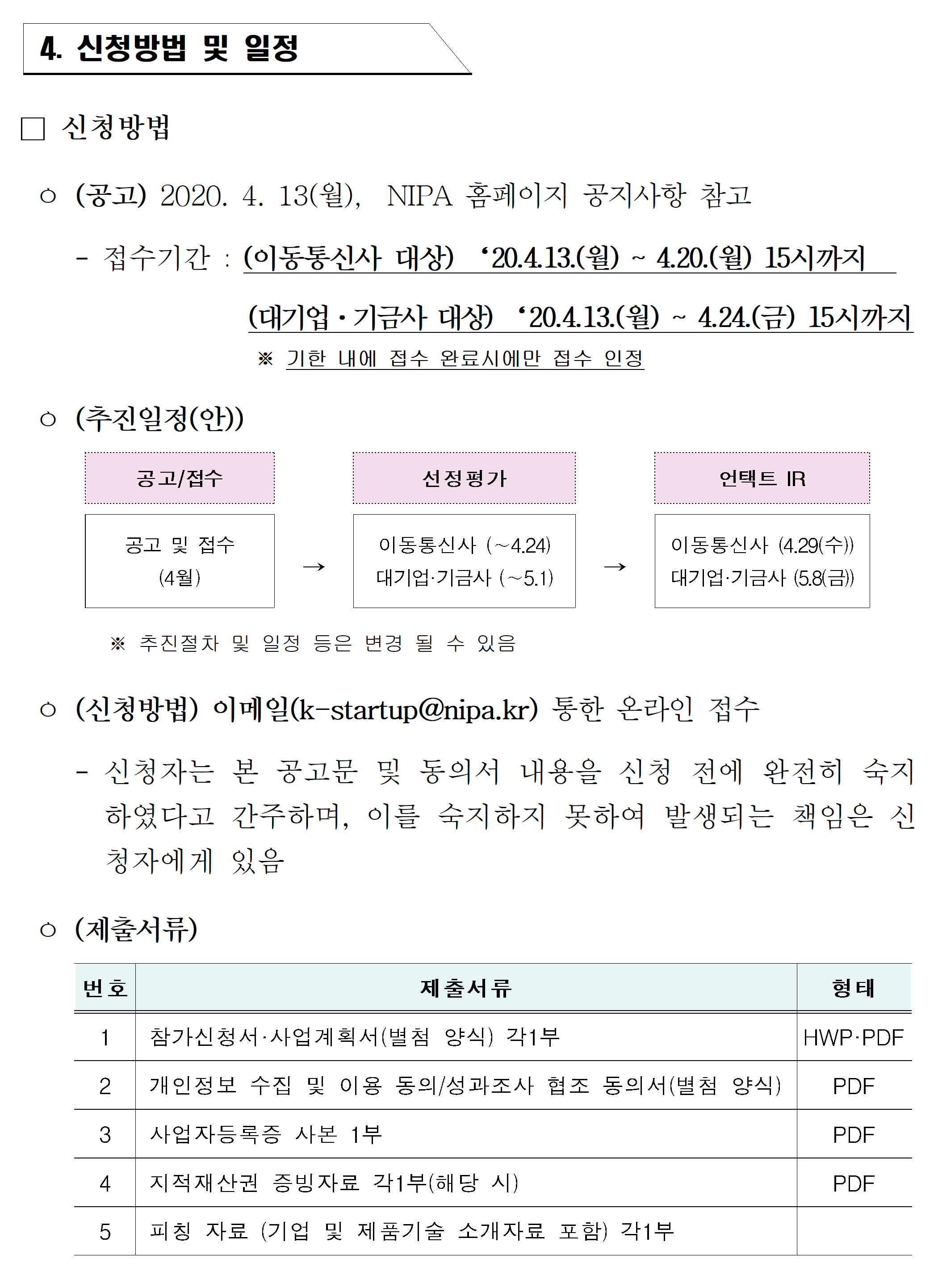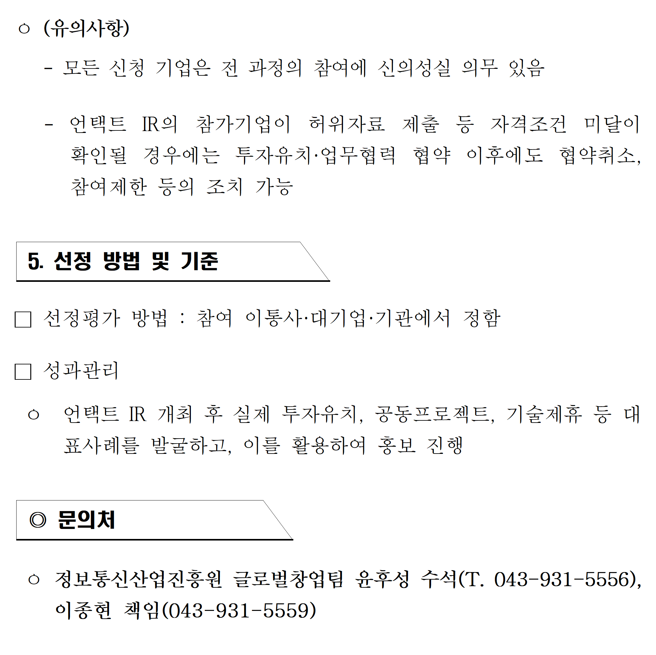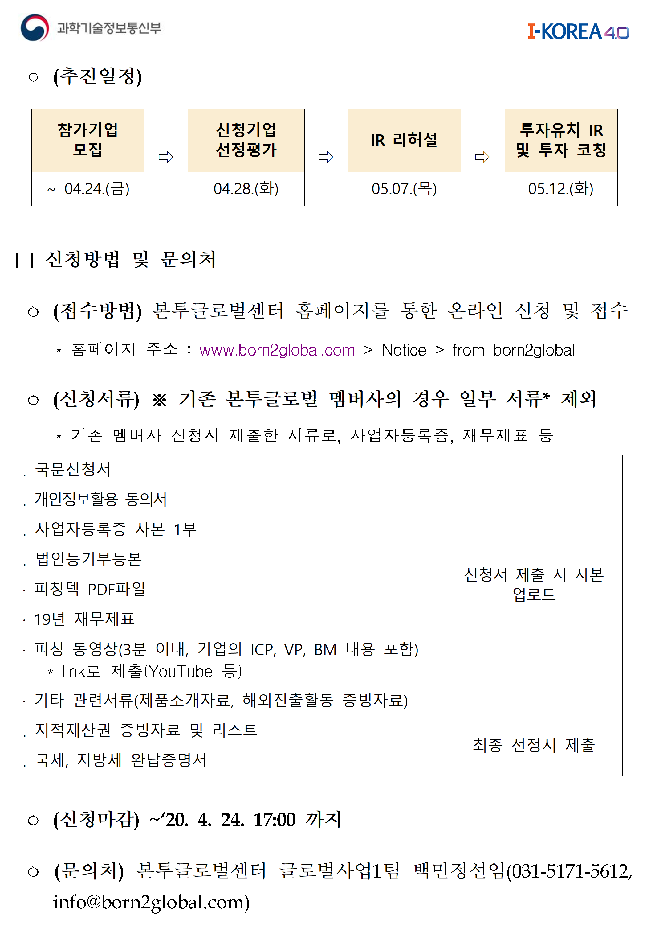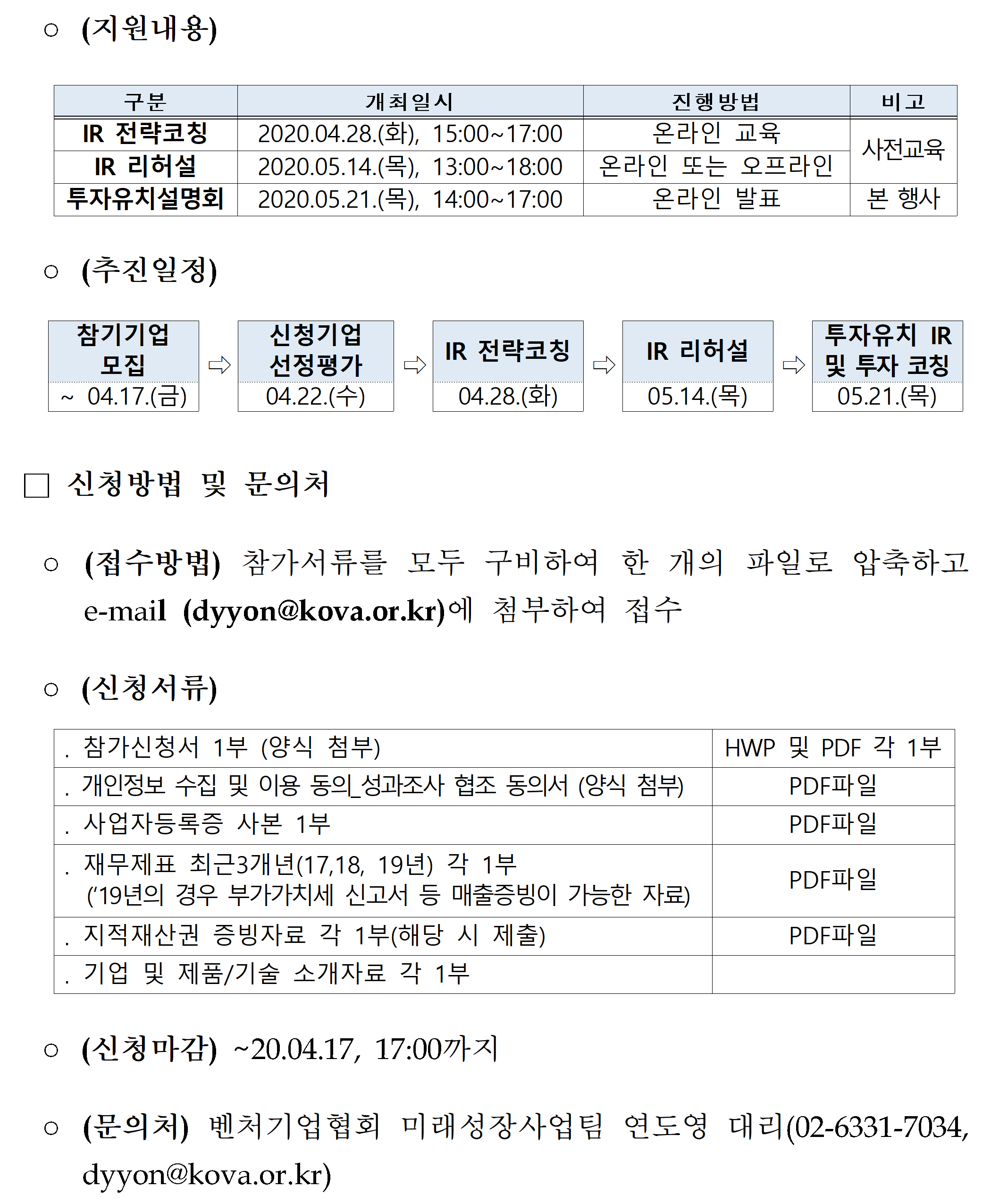 과학기술정보통신부 공고 제2020-0226호 2020년도 과학기술정보통신부 비대면 기업홍보 지원사업(언택트 IR) 통합공고 과학기술정보통신부에서는 최근 코로나19 확산으로 어려워진 정보통신기술분야 창업·벤처기업의 투자유치 및 업무협력을 위해 온라인 기업 홍보(IR)를 지원하는 언택트 IR을 아래와 같이 특별 시행하오니, 많은 참여와 신청 바랍니다. 2020. 4. 13. 과학기술정보통신부장관 1. 공통 사항 가. 추진 목적 ㅇ 최근 코로나19로 기업간 업무를 위한 대면 접촉이 곤란함에 따라 벤처·스타트업의 투자 유치나 대기업과 협업 추진이 위축되어, 온라인을 통한 실시간 비대면 홍보활동 지원으로 기업의 어려움 해소 나. 지원 분야 언택트 IR사업 대상 그룹(4개)별 구분 운영 및 지원 IR 대상 그룹 IR대상 ① 이동통신사 ② 대기업·기금사 ③ 국내VC ④ 해외VC·기업 참여기업· 기관 SKT, KT, LG U+, SK텔링크, KT파워텔, LG헬로비젼 삼성전자, LG CNS, 포스코, 신용보증기금, 기술보증기금, 신한 등 한국투자증권, KB인베스트먼트 등 140여개 VC 풀 선정 해외 유명 VC 및 글로벌 협력사업을 목적으로 하는 기업 다. 그룹별 개요 및 공고 일정 ‘이동통신사 대상’언택트 IR ㅇ 주관 : 한국통신사업자연합회(KTOA) ㅇ IR 대상 : SKT, KT, LG U+, SK텔링크, KT 파워텔, LG 헬로비전 ㅇ 지원 대상 : 3대 이동통신사·별정통신사와의 업무협력 및 투자 유치를 필요로 하는 ICT분야 벤처·스타트업 ㅇ 추진 일정 이동통신사 IR 회수 공고기간 선발기간 IR 행사일 제1회 4.13(월) ~ 4.20(월) 4.21(화) ~ 4.24(금) 4.29(수) 제2회 4.27(월) ~ 5.11(월) 5.12(화) ~ 5.19(화) 5.27(수) 제3회 5.18(월) ~ 6.1(월) 6.2(화) ~ 6.9(화) 6.24(수) ※ 제1회를 제외하고 ‘대기업·기금사 대상’ 언택트 IR과 공고기간 동일 ‘대기업·기금사 대상’언택트 IR ㅇ 주관 : 정보통신산업진흥원(NIPA) ㅇ IR 대상 : ‘ICT 창업벤처 민관협의체’ 유관 대기업* 및 기금사 * 삼성전자, LG CNS, 포스코, 롯데 액셀러레이터, 카카오 벤처스, 신용보증기금, 기술보증기금, 신한금융그룹 등 ㅇ 지원 대상 : 대기업·기금사와의 업무협력 및 투자유치를 필요로 하는 ICT분야 벤처·스타트업 ㅇ 추진 일정 대기업·기금사 IR 회수 공고기간 선발 및 매칭기간 IR 행사일 제1회 4.13(월) ~ 4.24(금) 4.27(월) ~ 5.1(금) 5.8(금) 제2회 4.27(월) ~ 5.11(월) 5.12(화) ~ 5.26(화) 6.5(금) 제3회 5.18(월) ~ 6.1(월) 6.2(화) ~ 6.16(화) 7.3(금) ‘국내 벤처캐피털(VC) 대상’언택트 IR ㅇ 주관 : 벤처기업협회(KOVA) ㅇ IR 대상 : 국내 VC (KB인베스트먼트 등 국내 140개사 풀 중 희망 VC 참여) ㅇ 지원 대상 : VC의 투자유치를 필요로 하는 ICT분야 벤처·스타트업* * 비대면 서비스 스타트업 우선 선발(예정) ㅇ 추진 일정 국내 VC IR 회수 공고기간 선발 및 코칭기간 IR 행사일 제1회 별도 공고를 통한 선발 완료 4.23(목) 제2회 4.2(목) ~ 4.17(금) 4.20(월) ~ 5.14(목) 5.21(목) 제3회 5.4(월) ~ 5.18(월) 5.20(수) ~ 6.11(목) 6.18(목) ‘해외 벤처캐피털(VC)·기업 대상’언택트 IR ㅇ 주관 : 본투글로벌센터(B2G) ㅇ IR 대상 : 해외 VC 및 기업 ㅇ 지원 대상 : 글로벌 진출을 목표로, 해외 투자유치 및 업무 협력을 필요로 하는 ICT분야 벤처·스타트업 ㅇ 공고 일정 해외 VC·기업 IR 회수 공고기간 선발 및 매칭기간 IR 행사일 제1회 4.13(월) ~ 4.24(금) 4.27(월) ~ 5.4(월) 5.12(화) 제2회 4.27(월) ~ 5.8(금) 5.11(월) ~ 5.25(월) 6.9(화) 제3회(예정) 5.11(월) ~ 5.29(금) 6.1(월) ~ 6.15(월) 7.7(화) 라. 기타 참고사항 ㅇ 본 사업은 코로나19 확산에 따라 기업간 대면이 어려운 현 상황에 맞춰 비대면 IR을 추진하는 것으로, 상황 종료시 일정이 별도의 예고없이 중단될 수 있음 ※ 일정 중단 시 대면 IR 전환 여부는 추후 검토·결정 ㅇ 그룹별로 지원 요건 및 제출 서류가 상이하므로 ‘2.세부 그룹별 공고’ 참고 필요 ※ 이동통신사 및 대기업·기금사 언택트 IR은 NIPA에서 ‘이동통신사·대기업·기금사’로 일괄 모집·공고함(KTOA 별도 공고 없음) 마. 언택트IR 관련 문의 ㅇ 사업문의(총괄) : NIPA 글로벌창업팀 이종현 책임(043-931-5559) IR 그룹명 담당기관 담당자 문의처 ‘이동통신사’ 언택트 IR 한국통신사업자연합 (KTOA) 정원선 대리 cws@ktoa.or.kr 02-2015-9115 ‘대기업·기금사’ 언택트 IR 정보통신산업진흥원 (NIPA) 윤후성 수석 k-startup@nipa.kr 043-931-5556 ‘국내 VC’ 언택트 IR 벤처기업협회 (KOVA) 연도영 대리 dyyon@kova.or.kr 02-6331-7033 ‘해외 VC·기업’ 언택트 IR 본투글로벌센터 (B2G) 백민정 선임 info@born2global.com 031-5171-5612 2. 언택트 IR 세부 그룹별 공고(1차) 1 이동통신사·대기업·기금사 대상 언택트 IR 공고 (NIPA) ICT 중소·벤처기업의 투자유치·업무협력 지원을 위한 ‘1차 언택트(온라인) IR’ 참가기업 모집 공고 정보통신산업진흥원에서는ICT 중소·벤처기업의 투자유치·업무협력을 위해 ICT 분야 창의·혁신적인 아이디어·기술을 보유한 중소·벤처기업을 지원하는 ‘1차 언택트(온라인) IR’ 참가기업을 모집하오니 많은 관심과 참여를 바랍니다. 2020. 4. 13. 정보통신산업진흥원장 1. 개요 코로나19 확산에 대응하여 ICT 특화분야(DNA(Data-Network-AI), 블록체인, VR·AR, IoT 등) 창의·혁신적 아이디어와 기술을 보유한 유망 중소·벤처기업에게 국내 이동통신사·대기업·기금사 대상 ‘언