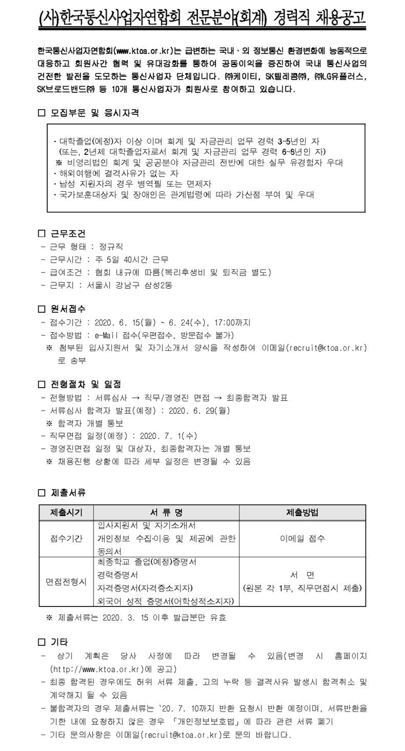 (사)한국통신사업자연합회 전문분야(회계) 경력직 채용공고