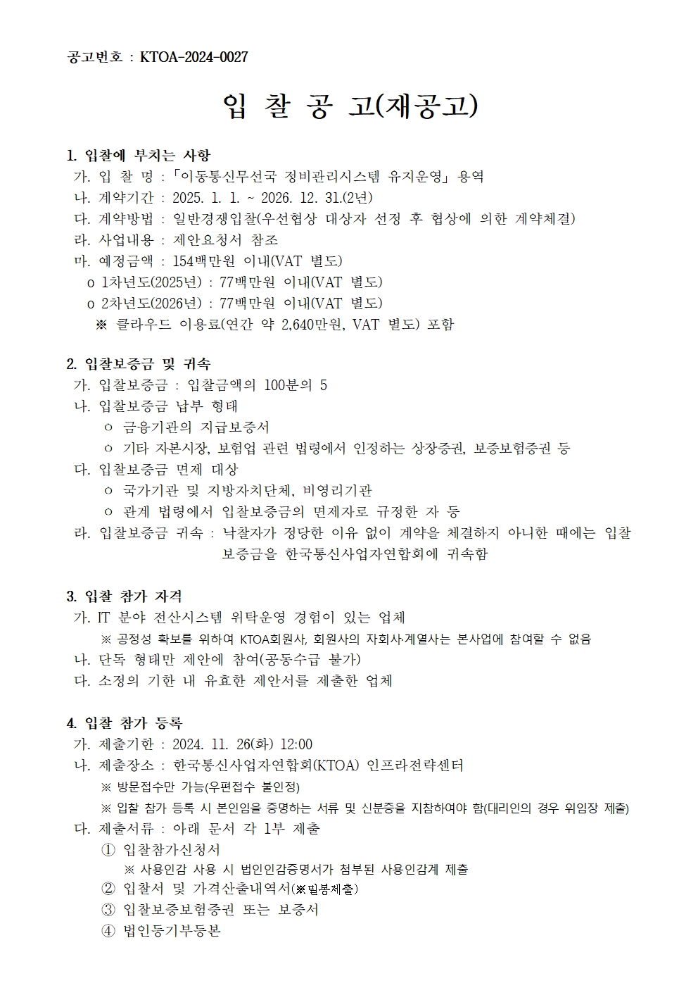 (재공고) 「이동통신 무선국 정비관리시스템 유지운영 용역」 입찰공고
