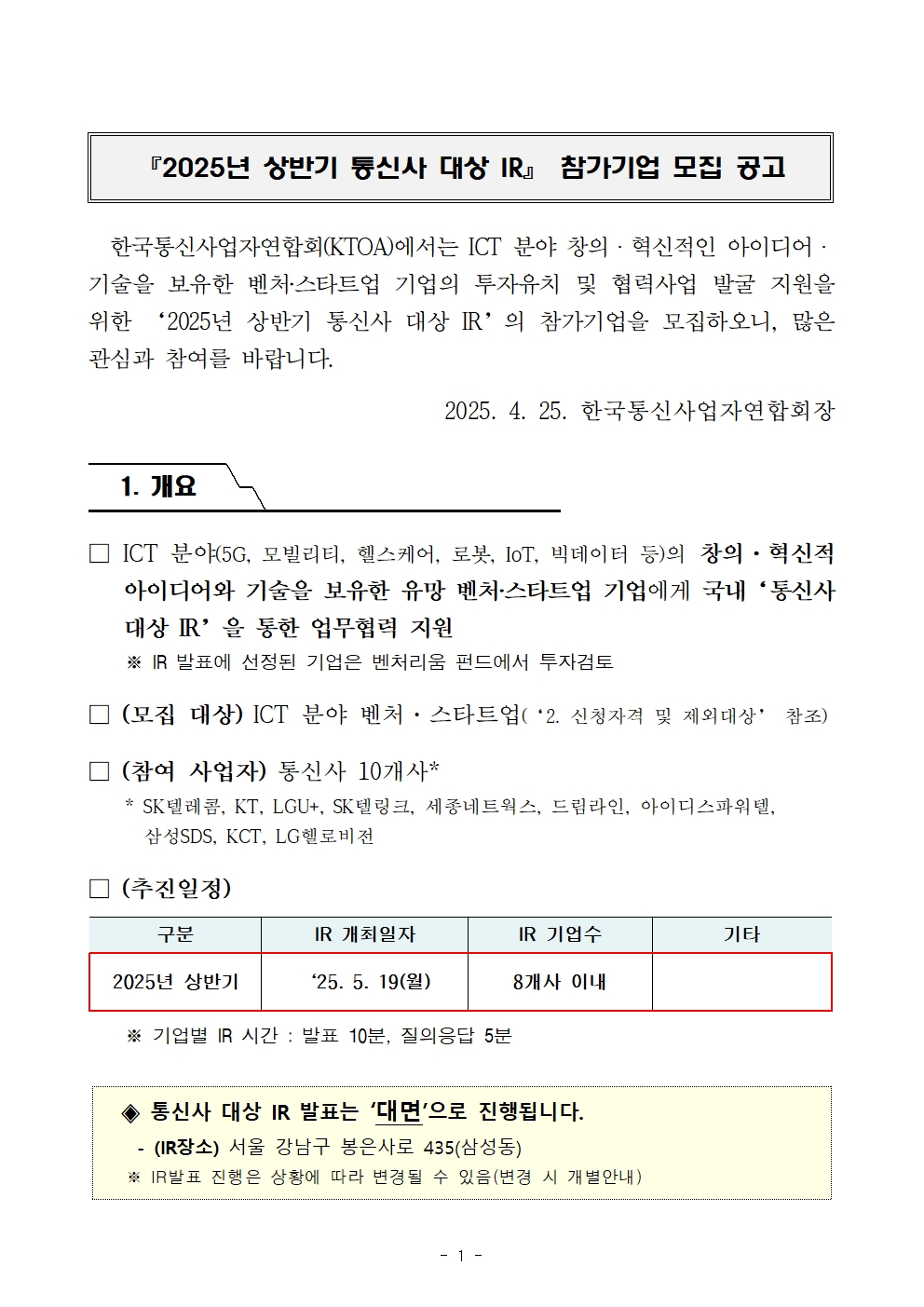 2025년 상반기 통신사 대상 IR 참가기업 모집