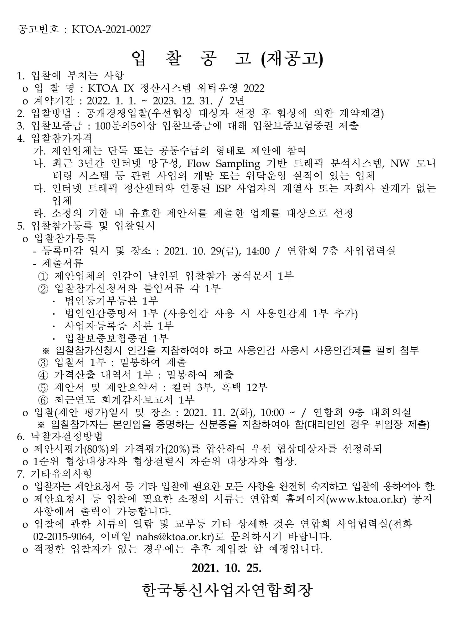KTOA IX 정산시스템 위탁운영 2022 입찰공고 (재공고)