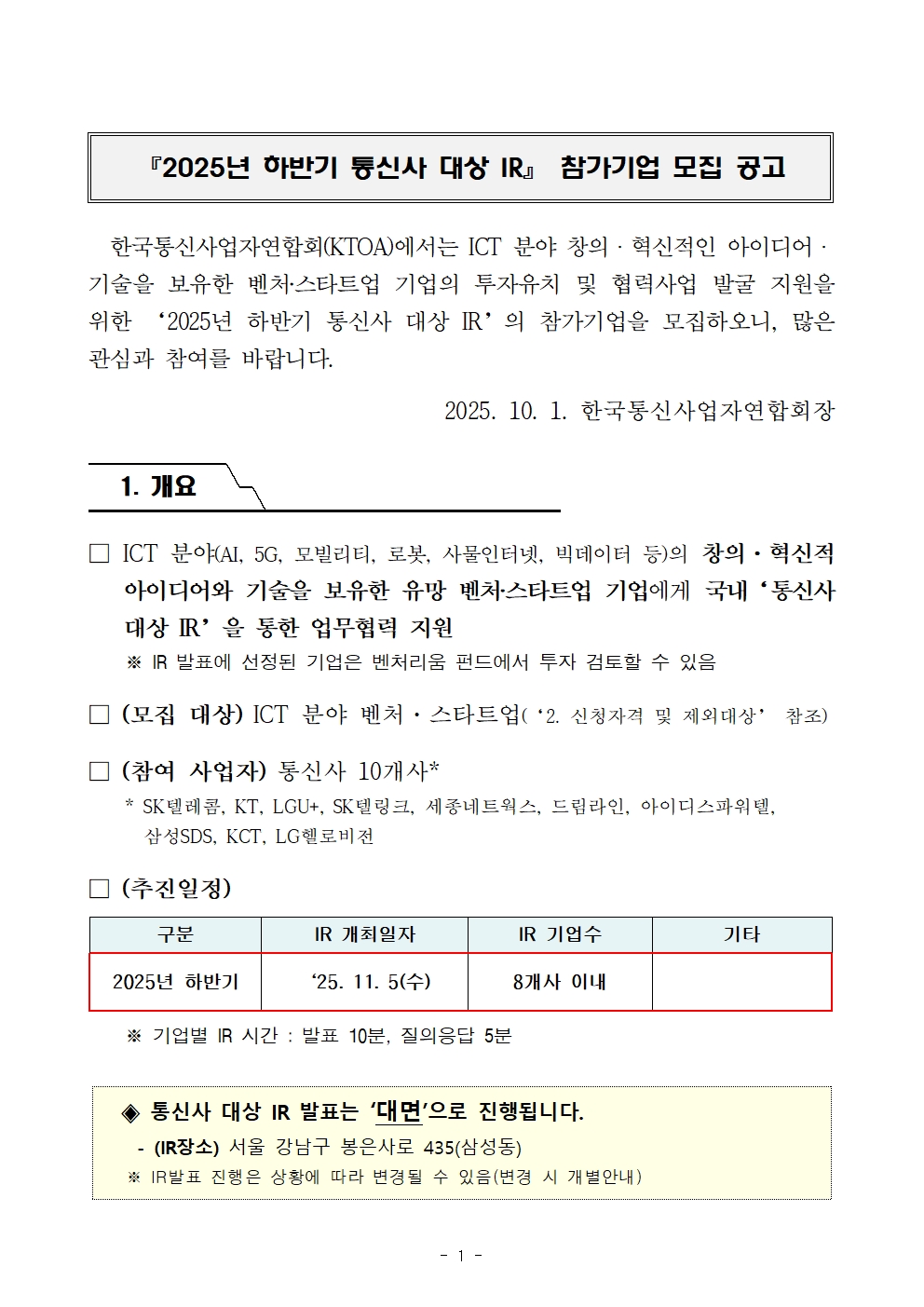 2025년 하반기 통신사 대상 IR 참가기업 모집공고